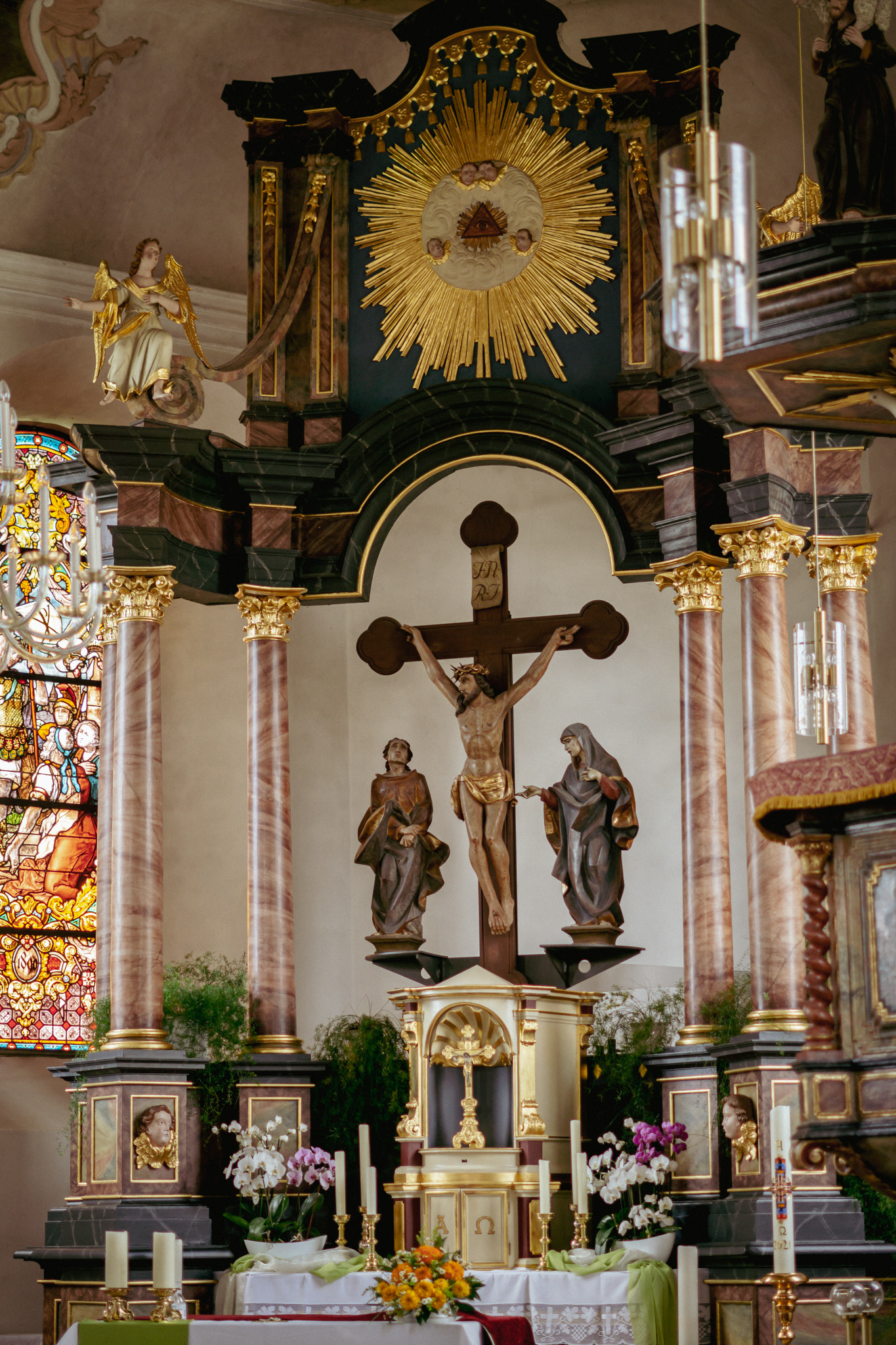 Das Kreuz ist Zeichen für Hoffnung und Leben. Die Kreuzbalken im Hochaltar münden in Kleeblätter - das Marterwerkzeug wird so zu einem Baum. Und Christus am Kreuz ist hier nicht als Sterbender dargestellt, sondern als lebender Hoffnungsträger.