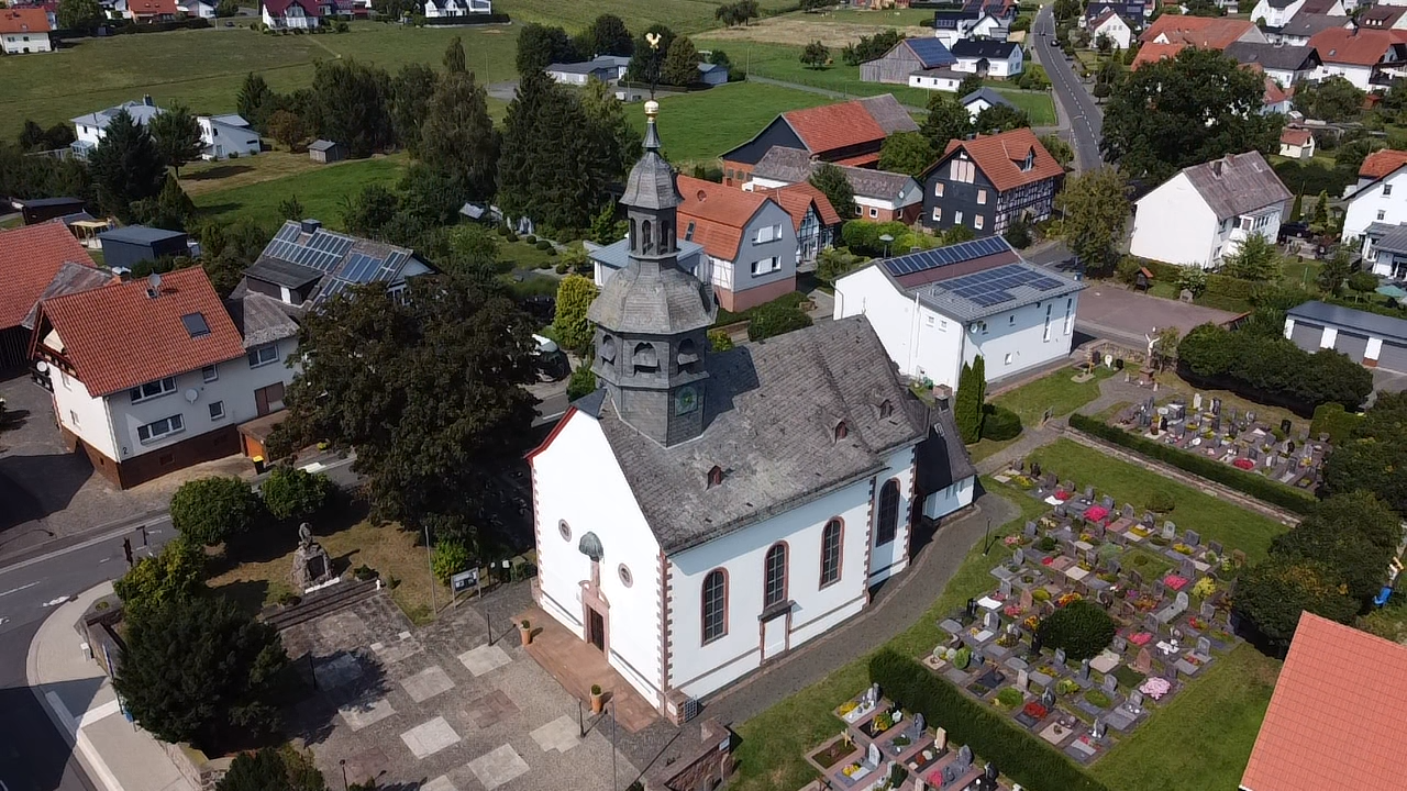 Wer durch den tagsüber immer geöffneten Eingang die Rüdigheimer Kirche betritt, wird überrascht sein von der Helligkeit und Farbenfülle des Raumes, der ihm dort begegnet. Barocke Lebensfreude und Begeisterung wird in den Gemälden und dem aufwändigen Stuck an der Decke deutlich.