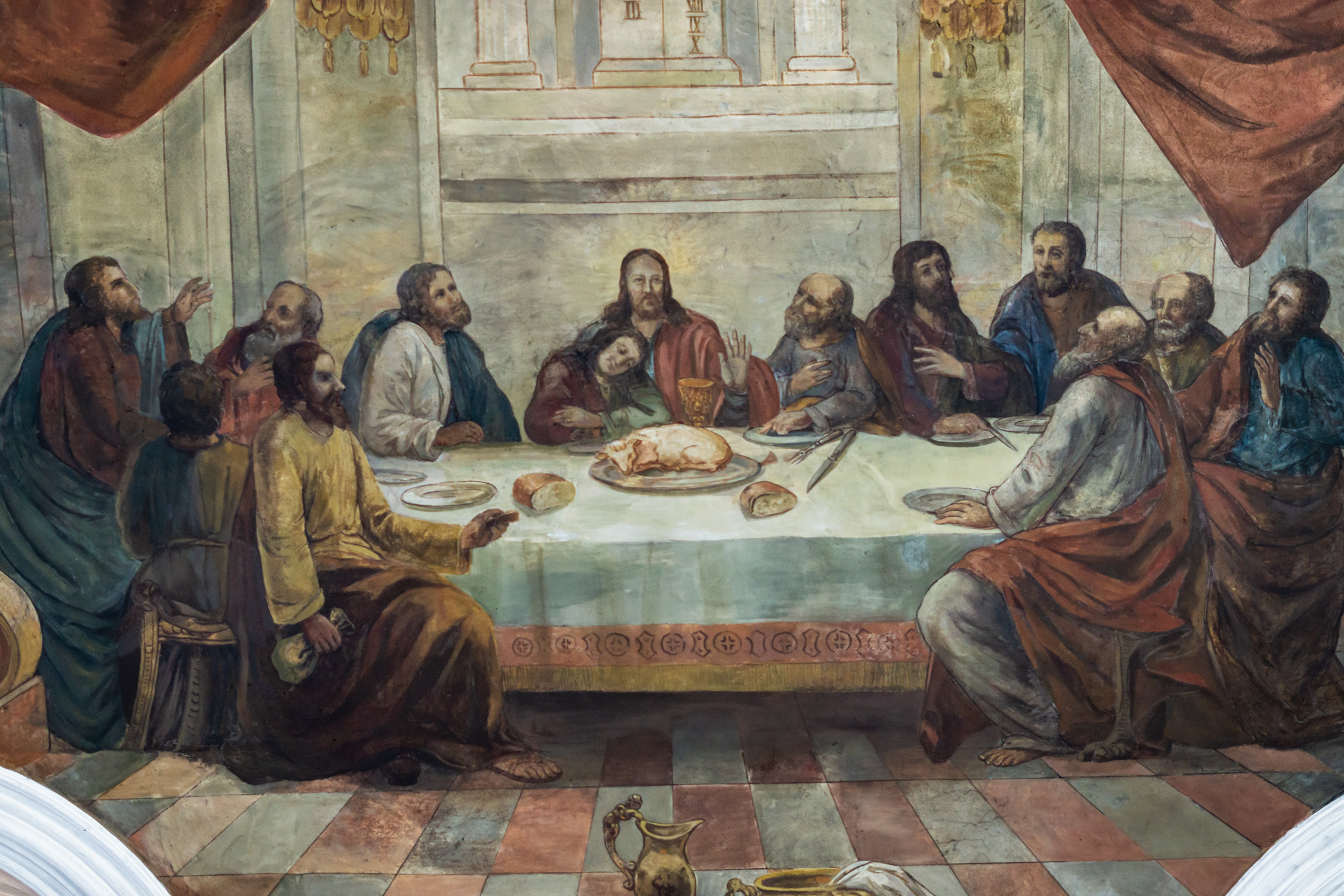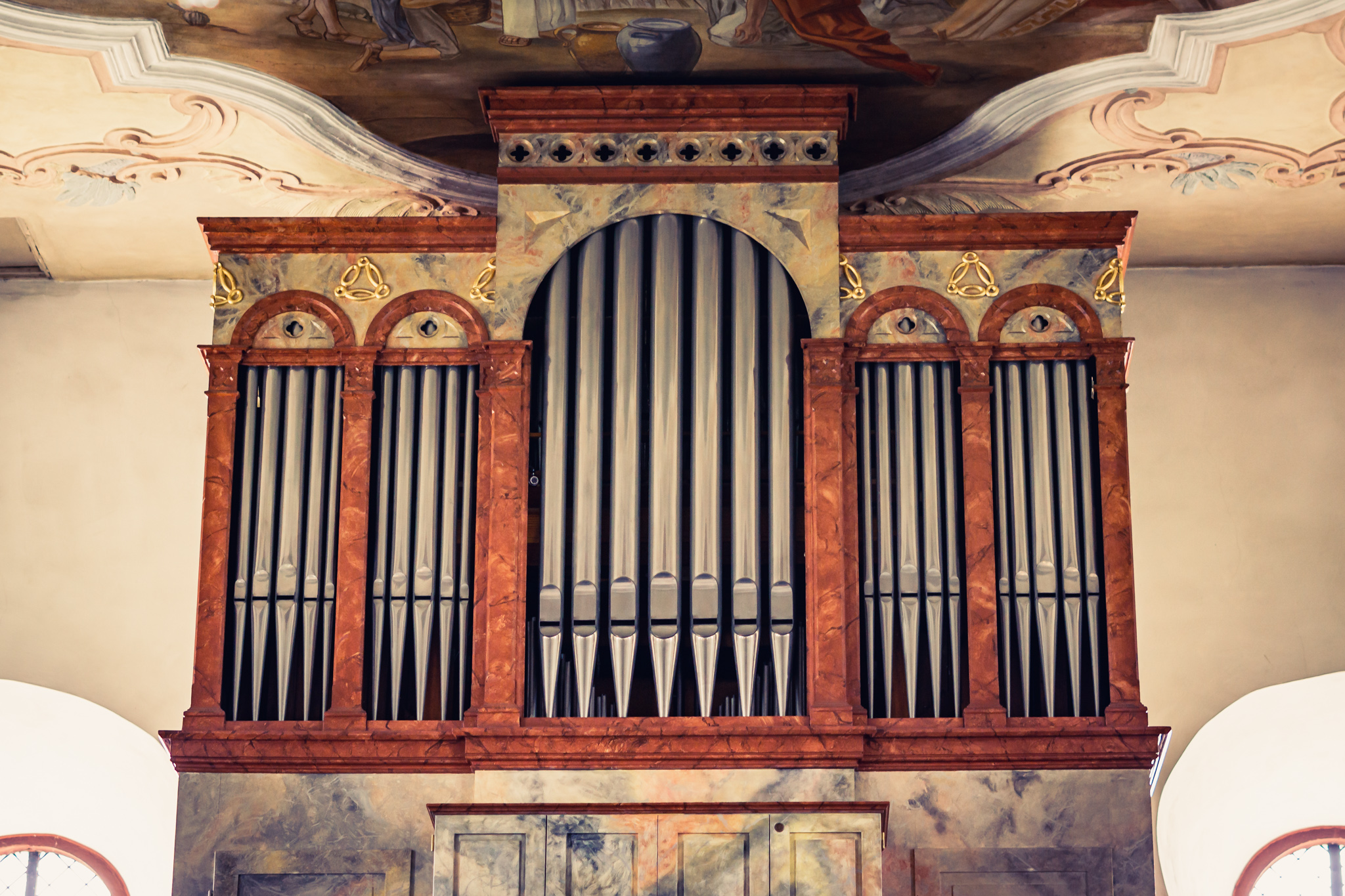 Ein durchdachtes theologisches Programm zum Thema "Kreuz" bestimmt drei große Deckengemälde und zehn kleinere Fresken in der Deckenschräge. Kunsthistorisch interessierte begeistern aber vor allem die aus Gips gefertigten Umrahmungen und Verzierungen dieser Bilder: imaginäre Füllhörner, Pfauenfedern, Weihrauchfässer und Blumensträuße sind da zu entdecken.
